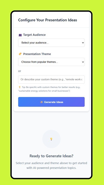 AI Presentation Writer Enter your topic, target audience, and goals—the app generates structured content with clear slides and talking points.